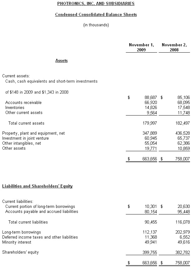 A conference call with investors and the media to discuss these results is scheduled for 8:30 a.m. Eastern time on Wednesday, December 9, 2009. The live dial-in number is 913-312-0713. The call can also be accessed by logging onto Photronics' web site at www.photronics.com.