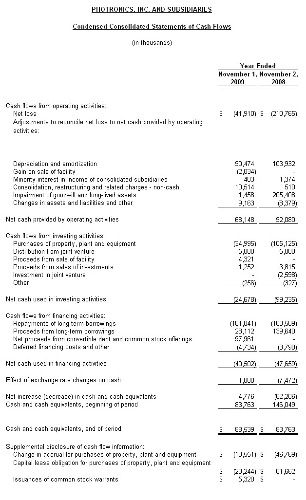 Constantine ("Deno") Macricostas, Photronics' chairman and chief executive officer commented, "During the fourth quarter we successfully recapitalized our balance sheet and paid down $65 million in debt. We also benefited from continued traction at the nanoFab where we gained additional market share with new qualified and volume production customers, while sequentially improving its operating cash flow. For the year Photronics significantly reduced fixed operating costs and realigned its global manufacturing network to better match customer demand. We enter 2010 in a solid position to capitalize on market improvement," concluded Macricostas.