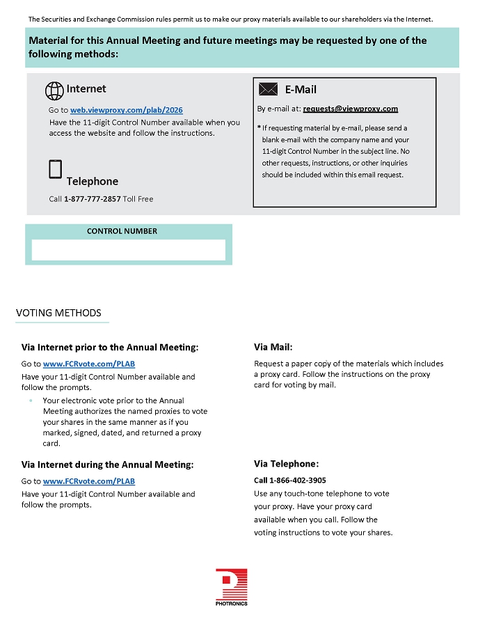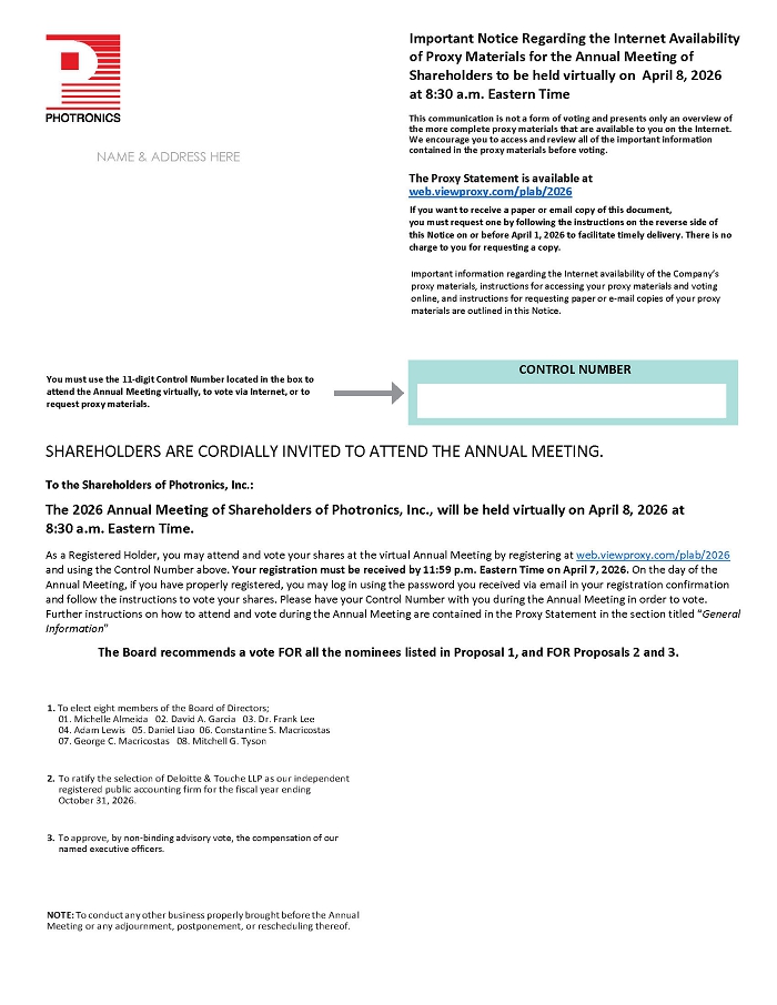 PHOTRONICS NAME ADDRESS HERE Important Notice Regarding the Internet Availability of Proxy Materials for the Annual Meeting of Shareholders to be held virtually on April 8, 2026 at 8:30 a.m. Eastern Time This communication is not a form of voting and presents only an overview of the more complete proxy materials that are available to you on the Internet. We encourage you to access and review all of the important information contained in the proxy materials before voting. The Proxy Statement is available at web.viewproxy.com/plab/2026 If you want to receive a paper or email copy of this document, you must request one by following the instructions on the reverse side of this Notice on or before April 1, 2026 to facilitate timely delivery. There is no charge to you for requesting a copy. Important information regarding the Internet availability of the Company's proxy materials, instructions for accessing your proxy materials and voting online, and instructions for requesting paper or e-mail copies of your proxy materials are outlined in this Notice. You must use the 11-digit Control Number located in the box to attend the Annual Meeting virtually, to vote via Internet, or to request proxy materials. CONTROL NUMBER SHAREHOLDERS ARE CORDIALLY INVITED TO ATTEND THE ANNUAL MEETING. To the Shareholders of Photronics, Inc .: The 2026 Annual Meeting of Shareholders of Photronics, Inc., will be held virtually on April 8, 2026 at 8:30 a.m. Eastern Time. As a Registered Holder, you may attend and vote your shares at the virtual Annual Meeting by registering at web.viewproxy.com/plab/2026 and using the Control Number above. Your registration must be received by 11:59 p.m. Eastern Time on April 7, 2026. On the day of the Annual Meeting, if you have properly registered, you may log in using the password you received via email in your registration confirmation and follow the instructions to vote your shares. Please have your Control Number with you during the Annual Meeting in order to vote. Further instructions on how to attend and vote during the Annual Meeting are contained in the Proxy Statement in the section titled "General Information" The Board recommends a vote FOR all the nominees listed in Proposal 1, and FOR Proposals 2 and 3. 1. To elect eight members of the Board of Directors; 01. Michelle Almeida 02. David A. Garcia 03. Dr. Frank Lee 04. Adam Lewis 05. Daniel Liao 06. Constantine S. Macricostas 07. George C. Macricostas 08. Mitchell G. Tyson 2. To ratify the selection of Deloitte Touche LLP as our independent registered public accounting firm for the fiscal year ending October 31, 2026. 3. To approve, by non-binding advisory vote, the compensation of our named executive officers. NOTE: To conduct any other business properly brought before the Annual Meeting or any adjournment, postponement, or rescheduling thereof.